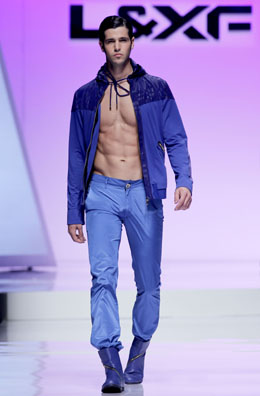 男裝品牌L&XF以“激情誘惑”“時空浪漫”兩個系列詮釋了“未來主義”的主題。“激情誘惑”展示了大面積藍色與紅色的搭配;“時空浪漫”中,高貴神秘的紫色、輕盈活力的果綠色等一系列明亮的色彩被創(chuàng)意組合“以往男裝總是給人色彩暗淡、線條呆板的印象,要打破男裝設(shè)計的單一化,就得進行大膽創(chuàng)新,比如藍色、紅色等明亮色彩就能夠搭配出視覺沖擊力,讓男人更加時髦而富有運動感!盠&XF設(shè)計師劉小飛向記者表達了這樣的觀點。