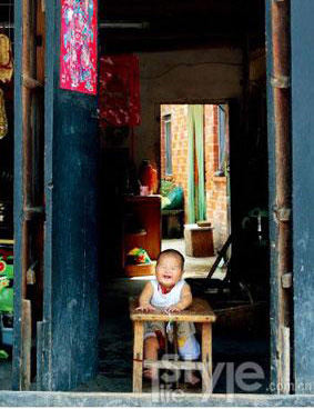 門口曬太陽的胖娃娃,一臉的喜氣洋洋。