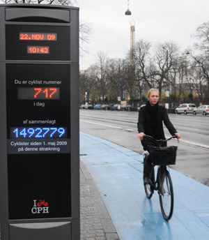 在丹麥?zhǔn)锥几绫竟,一名女子騎車經(jīng)過馬路旁的自行車流量顯示裝置。這個(gè)裝置自動(dòng)記錄通過這里的自行車數(shù)量。本版照片均由本報(bào)記者