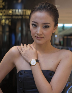 江詩(shī)丹頓2010年高級(jí)腕表巡展日前在香港尖沙咀海港城舉行,現(xiàn)場(chǎng)展出了100多枚腕表作品。圖為模特在展示一款腕表作品。