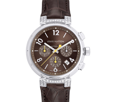 瑞士制造精鋼表殼,表耳鋪鑲鉆石,棕色鱷魚皮表帶,自動計時碼表機芯,防水深達(dá)100米。