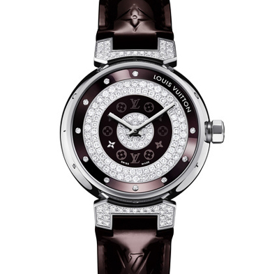 表殼直徑39.5毫米精鋼表殼,帶Monogram圖案的深紫紅色烤漆表盤表盤和表耳上鑲有白色的鉆石深紫紅色Monogram Vernis 皮質(zhì)表帶石英機芯