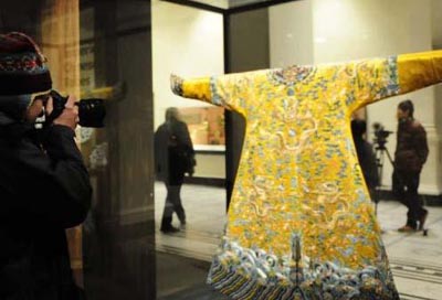 12月6日,在英國首都倫敦,一名攝影師在維多利亞和阿爾伯特博物館(V&A博物館)的“紫禁城皇室服飾展”媒體預(yù)展上拍攝一件龍袍。 來自中國故宮博物院的近百件中國清朝皇室服飾及衣料將于12月7日至2011年2月27日期間在倫敦著名的V&A博物館向公眾展出。這是歐洲范圍內(nèi)首次舉行中國清朝皇室服飾展。