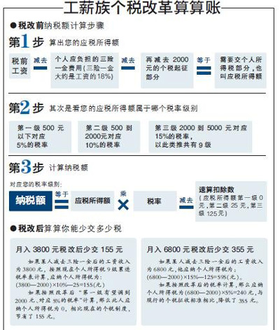 目前,第一級(jí)500元,即工資收入扣除2000元起征額后的收入,對(duì)應(yīng)5%的稅率;第二級(jí)2000元,10%的稅率;以此類推到5000元、20000元,稅率分別為15%、20%。