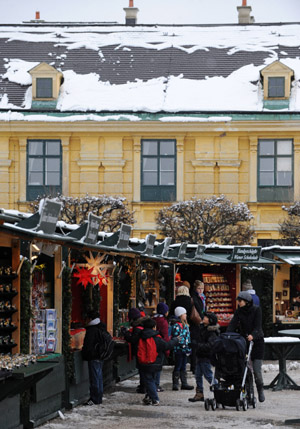 每年11月中旬,奧地利首都維也納市內(nèi)的20處大大小小的圣誕市場陸續(xù)開放,并一直開放至圣誕節(jié)前后,早早為整個城市營造節(jié)日氣氛,也成為市民和游客冬季休閑好去處。圖為孩子們在美泉宮圣誕市場游玩、購物。美泉宮坐落在維也納的西南部,曾是哈布斯堡王室的夏季行宮,總面積2.6萬平方米。這座氣勢磅礴的巴洛克風(fēng)格宮殿和花園,如今是維也納最負盛名的旅游景點。美泉宮及其花園已被聯(lián)合國教科文組織列入《世界文化遺產(chǎn)名錄》!