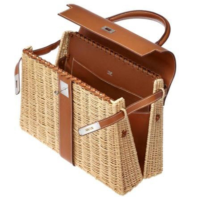 這款“鄉(xiāng)村凱莉包”(Country Kelly)是兩種傳統(tǒng)技藝結合的產(chǎn)物:籃子編制和皮革制作,優(yōu)雅簡潔,出人意料。兩個藤條外殼通過人字呢系帶與Barenia小牛皮部件—內(nèi)口袋、袋蓋和挎帶—相連,保證了皮包結構穩(wěn)固、便于握持?胺Q一款真正的野餐小竹籃。