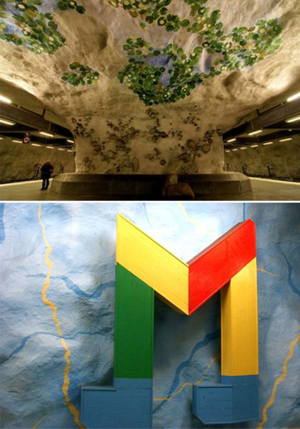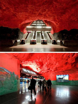 斯德哥爾摩地鐵的幾個站是在巖石中鑿開出來的,留有洞穴狀的“天花板”。