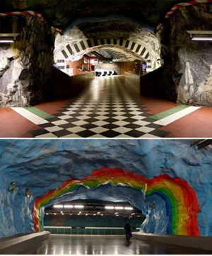 進入地鐵站時,人們要乘浮梯入地很深,突然會變的很冷,有種入地獄的感覺。為了讓旅客忘掉他們是在地下旅行,地鐵站通常設(shè)計得干凈而具有現(xiàn)代感,但瑞典斯德哥爾摩地鐵卻不是這樣,致力于提高生活品質(zhì)的瑞典人,把地下鐵建造成一條藝術(shù)長廊,總長108公里,每一站都是精心設(shè)計的藝術(shù)品。斯德哥爾摩的地鐵可以說是世界上最長的藝術(shù)博物館,這個全長為108公里的地鐵網(wǎng)是世界最長的地鐵網(wǎng),在一百多個地鐵站內(nèi)人們都能欣賞到不同藝術(shù)家的作品。