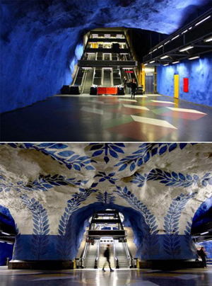 斯德哥爾摩地鐵的幾個站是在巖石中鑿開出來的,留有洞穴狀的“天花板”。它是古代和未來的結(jié)合。洞穴繪畫是其點睛之筆。在其100個地鐵車站中,有一半以上裝飾著不同的藝術(shù)品,它們表現(xiàn)著不同的主題,給斯德哥爾摩地鐵增添了生機勃勃的活力和憧憬。