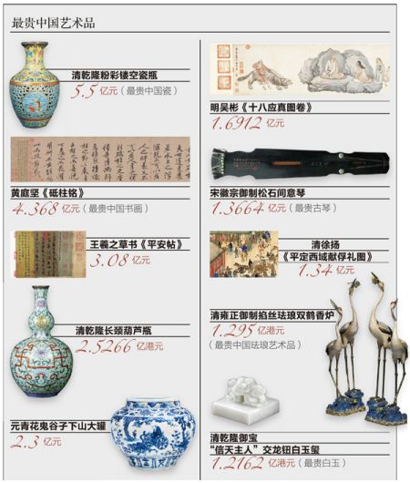 從2009年到2010年兩年間,全球最貴中國(guó)藝術(shù)品的前十名幾乎被全部刷新了一遍,只有原來(lái)的冠軍、2005年以2.3億元人民幣成交的“鬼谷子下山”元青花瓷瓶還依然在榜,F(xiàn)在,排在前10名的藝術(shù)品價(jià)格全部過(guò)億,最高的是11月份剛剛拍出的一件清乾隆粉彩鏤空瓷瓶,成交價(jià)