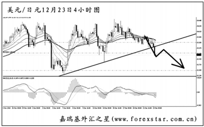 ▲美元兌日元已經(jīng)連續(xù)3周維持一個(gè)高位震蕩的走勢(shì),且匯價(jià)已經(jīng)將4小時(shí)圖的上升趨勢(shì)線跌破,階段性的頂部有望構(gòu)筑成功。從日線圖上看,由于美元兌日元遲遲未能挑戰(zhàn)9月中旬日本央行干預(yù)后的高點(diǎn)阻力,所以后市的漲勢(shì)不容樂(lè)觀。短線可轉(zhuǎn)為看空的思路。