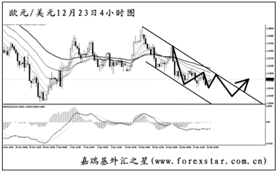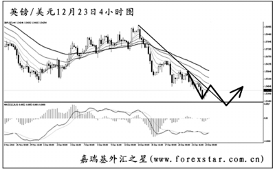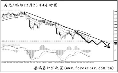 ▲美元兌瑞郎在跌破了日線圖的旗形中繼下沿之后,跌勢(shì)被進(jìn)一步確立,圖中下降趨勢(shì)線和均線系統(tǒng)的壓制作用完好。現(xiàn)在匯價(jià)正在遭遇10月中旬的低點(diǎn)0.9460支撐,若跌破,下方將幾乎沒(méi)有能夠阻擋住匯價(jià)下跌的點(diǎn)位。操作上以繼續(xù)做空為主,但最好等待支撐被跌破后再行進(jìn)場(chǎng)。
