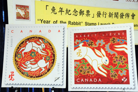 加拿大郵政總局宣布將在2011年1月7日發(fā)行兔年生肖郵票,以慶祝中國(guó)農(nóng)歷辛卯兔年,這是加拿大新一輪生肖系列郵票中的第三套,分為國(guó)內(nèi)版和國(guó)際版。這款兔年生肖郵票樣本日前在溫哥華亮相,左為國(guó)際版,右為國(guó)內(nèi)版。