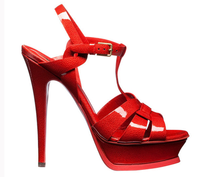 YSL的Tribute系列有多種款式,包括船鞋、T帶涼鞋和slingback涼鞋等,其中標(biāo)識(shí)度最高的當(dāng)屬T帶涼鞋,每季款式不變,色彩和材質(zhì)隨潮流而變。Tribute系列的典型標(biāo)志是層次鮮明的水臺(tái)底,鞋尖部分削掉一塊,不顯厚重。2011早春系列的Tribute