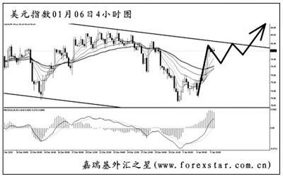 美元指數(shù)繼續(xù)保持在日線圖的旗形通道內(nèi)震蕩調(diào)整,盤整期已經(jīng)超過了一個(gè)月,后市只要有效突破旗形上沿80.45一線的阻力,上沖的力度料將十分猛烈。短線美元指數(shù)主要是強(qiáng)動(dòng)能交替的節(jié)奏,客觀趨勢橫盤。圖中MACD顯示多頭動(dòng)能充盈,預(yù)計(jì)旗形上沿將給美元指數(shù)一定的上行壓力,但最終成功上破的概率較大。