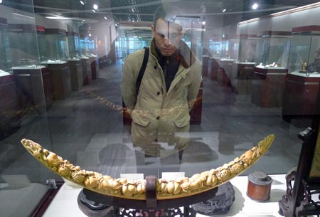 1月5日,在杭州舉辦的“海外回流藝術(shù)品精品展”上,一名參觀者在欣賞清代象牙雕刻《五子鬧!。