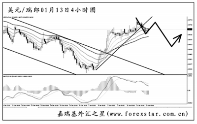 ▲美元兌瑞郎在突破了此前的下降通道上沿后,上沖力度強(qiáng)勁,圖中的均線系統(tǒng)已經(jīng)轉(zhuǎn)為向上排列。短線MACD發(fā)生了頂背離信號(hào),同時(shí)上升趨勢(shì)線跌破,后市面臨一波下行回調(diào)。美元兌瑞郎下方的首要支撐在道氏理論點(diǎn)0.9595一線,若跌破,則匯價(jià)有望向0.9450一帶調(diào)整。