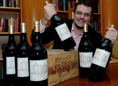1月19日,媒體預(yù)展上工作人員正展示估價(jià)12萬(wàn)至16萬(wàn)港元的6瓶1.5公升裝1989年奧比昂佳釀和一箱估價(jià)28萬(wàn)至40萬(wàn)港元的12瓶裝1989年柏翠寶佳釀(中)!