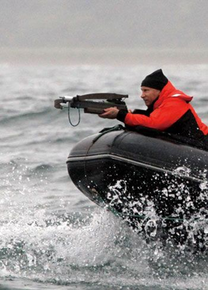 在堪察加半島海域飛馳的橡皮快艇上,普京趴在船頭射鯨,這是為了取得一小塊鯨魚皮膚用作科研。當(dāng)射中后,普京相當(dāng)興奮,對記者大喊:“我射了4次,終于射中了!倍霈F(xiàn)在中文媒體的標(biāo)題則是:《普京射鯨》。還射了4次。