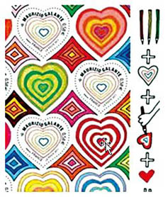 其中面值0.58歐元的郵票是自由上色郵票(圖1),主圖是5層心形,使用者可以根據(jù)自己的喜好給各層心形涂色,郵票左下的小圖案就是使用說明;面值0.95歐元的郵票上有一顆大紅心(圖2),這顆紅心是采用燙印技術(shù)印上的一層可以刮掉的膜,使用者可以用筆在上面刮劃出自己的名字或想說的簡短話語,左下小圖說明中紅心上的MG就是設(shè)計師姓名的縮寫。