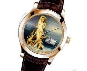 在這枚三問表之上,積家選擇了4幅經(jīng)典畫作之一的愛神維納斯畫像為主題,為Master Minute Repeater三問腕表的表盤進行琺瑯彩繪裝飾。盤面的名畫與三問悠揚的敲擊聲更突顯其貴族般的氣質(zhì)。定價超過200萬元,有名畫、有琺瑯,還有豐富而純凈的報時鈴音。藝術(shù)氣質(zhì)超群。