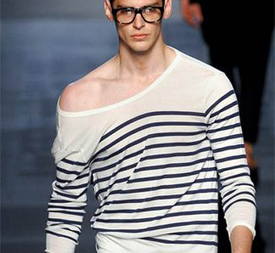Gaultier依舊將喜歡的海軍藍(lán)條紋衫置于2011年春夏新系列中,在T臺(tái)上與白色長(zhǎng)褲、白色尖頭皮鞋搭配在一起,一派摩登好少年模樣;同樣是條紋衫+白褲、白鞋,Junya