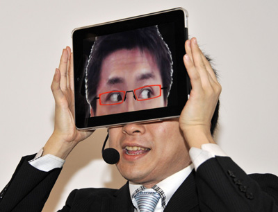 一名日本魔術師在東京用蘋果iPad平板電腦變魔術。