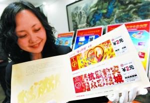 圖為工作人員在展示2008年發(fā)行的抗震救災(zāi)“愛(ài)心附捐”文化車(chē)票。