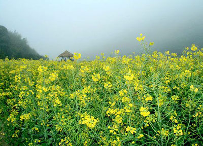 在海拔1000米的石灶天池上的石門國家森林公園里,有著被譽(yù)為廣東第一高山的油菜花海。上百畝的油菜花田,綿延了將近兩公里。微風(fēng)吹來,漫山遍野的金黃色如波浪翻涌,在茂密森林和天然河谷的映襯下,構(gòu)成一幅心曠神怡的田園風(fēng)光圖。今年公園更新設(shè)了獨(dú)特的“梯田油菜花”,站在頂端之上,一級級交錯的油菜花海就在腳下,仿如一本立體的燙金畫冊。