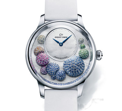 采用雅克德羅自動上弦2653機(jī)芯,手表直徑41毫米,18k白金表殼,珍珠母貝表盤,上鑲35顆黃寶石,154顆藍(lán)寶石,51顆粉色寶石,22顆橙色寶石以及46顆石榴石,限量發(fā)售8只