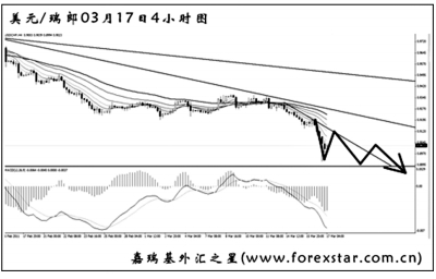 ▲美元兌瑞郎在經(jīng)過了3周的橫盤之后,選擇繼續(xù)加速下行,且下跌斜率再度加大。由于美元兌瑞郎已經(jīng)創(chuàng)出歷史新低,下方已沒有任何支撐可以托住匯價(jià),但下跌力度過大,預(yù)計(jì)將發(fā)生一定的調(diào)整,圖中最下方一條壓力線將首先遭到挑戰(zhàn),但想直接觸碰中間那條趨勢(shì)線的難度較大。