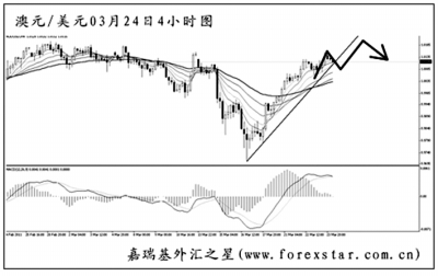 ▲澳元兌美元最近一波上漲的斜率十分陡峭,匯價重新向1.0255的前方高點阻力發(fā)起沖擊。從圖中看,澳元已經接近了上升趨勢線的支撐位,且此趨勢線的角度很大,同時考慮到短線發(fā)出的MACD頂背離信號,預計匯價將小幅跌破此線。后市澳元有望再走出一小波沖高,但沖破1.0255的概率不大。