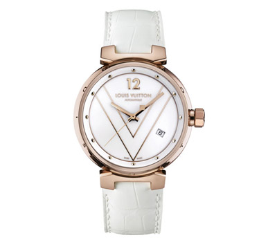 表盤(pán)V形標(biāo)志的設(shè)計(jì)靈感來(lái)自路易威登經(jīng)典皮具——Steamer手袋。獨(dú)特而醒目的標(biāo)志襯托出這款腕表細(xì)致、含蓄的特質(zhì)。玫瑰金和白色烤漆的完美結(jié)合將Tambour