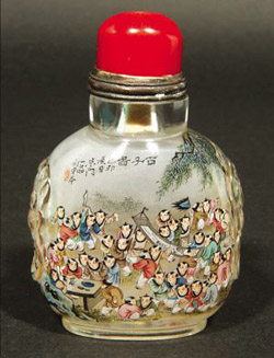 1949年新中國(guó)成立,為恢復(fù)傳統(tǒng)的藝術(shù)文化,1953年國(guó)家為葉曉峰、葉奉祺于北京成立一車間,開(kāi)班授徒,四名學(xué)徒為王習(xí)三(現(xiàn)為中國(guó)工藝美術(shù)大師)、劉守本(現(xiàn)為中國(guó)工藝美術(shù)大師)、葉樹(shù)英、丁桂玲。當(dāng)今京派掌門人劉守本大師繼承傳統(tǒng)京派風(fēng)格,他全面繼承了葉家內(nèi)畫傳統(tǒng)技藝,并從傳統(tǒng)中總結(jié)經(jīng)驗(yàn),創(chuàng)立了更完善的技法,形成自己獨(dú)特的技術(shù)風(fēng)格,在京城文化的吸引和熏陶之下,劉守本大師的內(nèi)畫鼻煙壺也呈現(xiàn)出濃郁的京味。北京瀚海2009春季拍賣會(huì)上,劉守本大師的《百子圖》以12萬(wàn)元成交。
