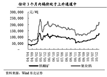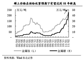 銀河證券評論稱,《通知》表明國家將長期持續(xù)整頓和規(guī)范鎢、銻和稀土行業(yè)。國家堅持總量控制的同時,將暫停受理新的鎢、銻和稀土礦勘查開采登記申請時間從2011年6月30日延長一年,到2012年6月30日,會加劇市場的資源緊張感受。