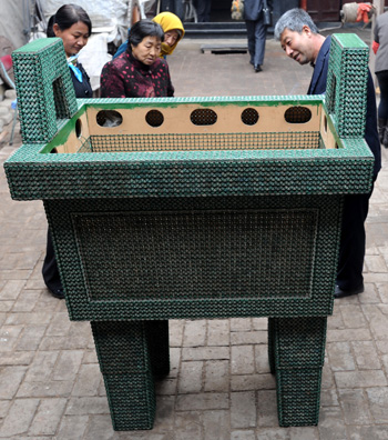 山西省左權(quán)縣72歲的收藏愛好者王艾甫用50余年收集來的古錢幣,制作成了一只高1.6米、寬1.2米的大鼎。這件名為“開元盛鼎”的作品由一萬八千余枚形式相同的“開元通寶”銅幣組成,耗時(shí)5年方制作完工,正準(zhǔn)備申報(bào)吉尼斯世界紀(jì)錄。王艾甫說,他希望把“開元盛鼎”作為建黨90周年的獻(xiàn)禮,祝福祖國繁榮昌盛。圖為參觀者在觀看“開元盛鼎”作品。