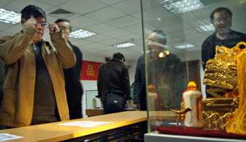 一瓶被譽(yù)為“酒王”的“精裝漢帝茅臺(tái)酒”成交價(jià)高達(dá)890萬元,刷新了茅臺(tái)酒拍賣成交價(jià)格的歷史紀(jì)錄。新華社發(fā)(彭年/攝) |