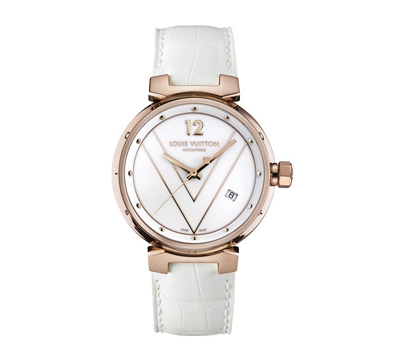 表盤(pán)V形標(biāo)志的設(shè)計(jì)靈感來(lái)自路易威登經(jīng)典皮具Steamer手袋。獨(dú)特而醒目的標(biāo)志襯托出這款腕表細(xì)致、含蓄的特質(zhì)。玫瑰金和白色烤漆的完美結(jié)合將Tambour
