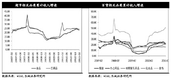從估值來看,中信證券認(rèn)為:行業(yè)估值處于相對低位,再現(xiàn)系統(tǒng)性買入機(jī)會。報(bào)告稱,自2010年11月9日商業(yè)零售行業(yè)指數(shù)見頂以來,分別在2011年1月25日和3月31日兩次探底但底部逐漸抬高,目前2011年至2012年動態(tài)PE中值水平分別為23、20倍,估值水平處于相對低位,其中部分公司2011年P(guān)E近20倍。而我們重點(diǎn)跟蹤的零售公司預(yù)計(jì)未來3年利潤的復(fù)合年均增長率大于30%;零售股與大盤的估值比價(jià)倍數(shù)為1.52倍,處于歷史均值水平。