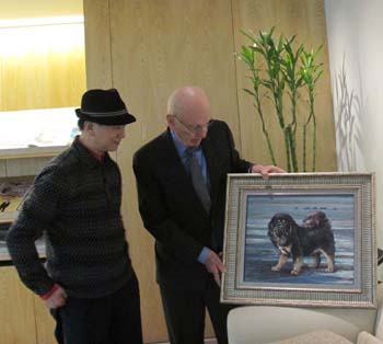 5月4日,在美國紐約曼哈頓的新聞集團大廈,傳媒大亨默多克(右)與中國著名的東方畫獒大師林躍欣賞藏獒油畫。林躍以畫藏獒聞名中國畫壇,近幾年逐漸為世人所知。當默多克在網(wǎng)上看到林躍的藏獒油畫后,表示一定要擁有一張藏獒油畫,今日他如愿以償。新華社發(fā)(李群子/攝) |