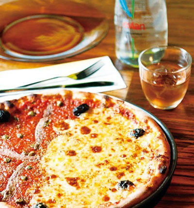 披薩一半是芝士味,另一半是銀魚(yú)柳配水瓜榴。先將面團(tuán)拉成14寸的底后涂抹上番茄醬,然后再分開(kāi)制作。芝士部分用的是法國(guó)芝士;另一半是銀魚(yú)柳配水瓜榴,全部餡料下好后,就放進(jìn)披薩爐中烘烤。新鮮出爐的披薩搭配一杯餐前酒就更完美。