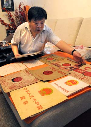 今年50歲的張建洛,是河南省洛陽(yáng)市的一名普通市民。他從30多年前就開(kāi)始收藏各種唱片和留聲機(jī)。在他收藏的15000多張唱片中,有一套經(jīng)過(guò)精心整理的“國(guó)歌唱片檔案”格外惹人注目。據(jù)史料記載,《義勇軍進(jìn)行曲》從1934年誕生,到新中國(guó)成立后被定為代國(guó)歌、共有16個(gè)版本,張建洛收集了所有版本的唱片,包括1934年的電影《風(fēng)云兒女》插曲《義勇軍進(jìn)行曲》,1941年美國(guó)著名黑人音樂(lè)家保羅?羅伯遜演唱的《義勇軍進(jìn)行曲》,1949年《義勇軍進(jìn)行曲》作為代國(guó)歌在開(kāi)國(guó)大典上演奏的音樂(lè)版,1978年經(jīng)過(guò)重新填詞的“新”國(guó)歌等,張張堪稱經(jīng)典。張建洛準(zhǔn)備將他的國(guó)歌唱片在建黨90周年時(shí),用它收藏的東方紅牌留聲機(jī)播放給市民聽(tīng),和大家一起分享歷史的回聲。