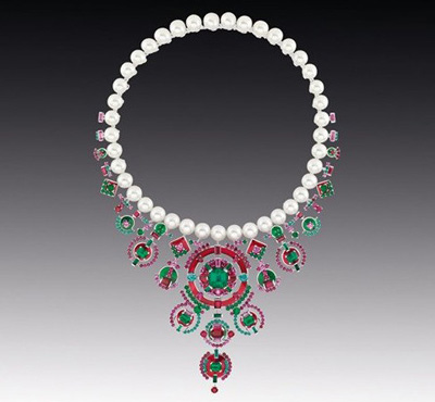 Mosaque項(xiàng)鏈,18K白金,鑲嵌鉆石、珍珠、紅寶石、祖母綠、以及粉紅藍(lán)寶石, 并以彩漆裝飾。