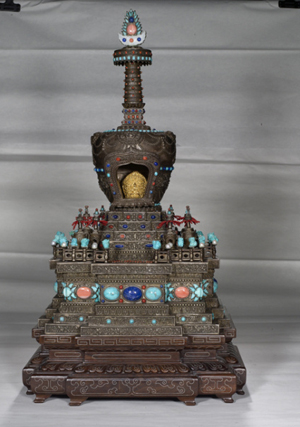 由北京市文化局、榮寶齋聯(lián)合主辦的全國最大規(guī)模“非物質(zhì)文化遺產(chǎn)”代表性傳承人作品拍賣會日前落槌,其中運用蒙鑲工藝制作而成的《銀鎏金鑲百寶佛塔》拍出120萬元人民幣,為本場拍賣會之最。蒙鑲工藝傳承人吳中鳳帶來的另一件作品《銀鎏金鑲百寶七珍》也被買家以85.8萬元收入囊中。