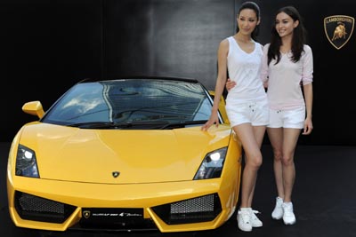 全新蘭博基尼Gallardo LP 560-4 Bicolore特別版超級(jí)跑車日前正式在香港推出。這款Gallardo跑車采用了雙色面漆,由車頂至車尾發(fā)動(dòng)機(jī)蓋都噴涂黑色車漆,而車身則為橙黃色,突出動(dòng)感十足的車身線條。該車配備的V10發(fā)動(dòng)機(jī)擁有560匹馬力,從靜止加速至100km/h僅需3.7秒,最高時(shí)速可以達(dá)到325km/h。圖為模特劉碧麗(右)、姚予睛參加新車發(fā)布會(huì)。