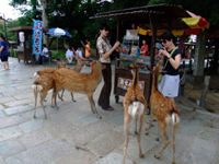 奈良的鹿“懂得”商業(yè)規(guī)則。鹿餅攤上擺著的鹿餅,雖垂口可食,但絕不伸嘴,就坐臥在旁邊等著游客來(lái)遞錢購(gòu)買?匆(jiàn)有人過(guò)來(lái),鹿也站起身,在你后面靜等。游客交了錢,鹿餅包剛拿到手,它們就蹭過(guò)來(lái),挨著你的身體跟戀人似的“親密接觸”,也不管你怕不怕、嫌不嫌。反正那意思就是——你不就是為我買的嗎不給我吃給誰(shuí)?你要是顯得摳門兒,只喂給一小片就把煎餅包要藏進(jìn)自己的口袋或者高舉起來(lái)扭身便走,脾氣不好的鹿可能就會(huì)叼住你的衣襟嚇得你呀呀嗷嗷亂叫。而比較紳士淑女的鹿呢,就會(huì)拉開(kāi)半米的距離向你鞠躬,姿態(tài)相當(dāng)優(yōu)雅。