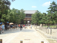 東大寺位于奈良公園偏西側(cè),是觀光勝地。近鐵電車奈良站下車一出站,走不幾步就會(huì)遇上鹿。聰明的鹿多半等在出售鹿餅的攤床旁邊。鹿餅原材料是米糠,加少許面粉壓成,但不含任何香料糖分。小孩巴掌大小的鹿餅約三四毫米薄厚,膨松香脆,人亦可食。路邊攤床賣的鹿餅每包10枚,標(biāo)價(jià)150日元。收益中有一部分用來(lái)充作鹿愛(ài)護(hù)會(huì)經(jīng)費(fèi)。