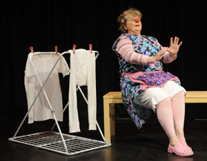 她臉上化著淡妝,身穿一條普通裙子,外罩一條圍裙,表演內(nèi)容包括與一匹布馬爭(zhēng)斗,隨后一邊等待衣物變干,一邊聽收音機(jī),跟隨音樂打拍子,左搖右晃,最后跳起舞來。