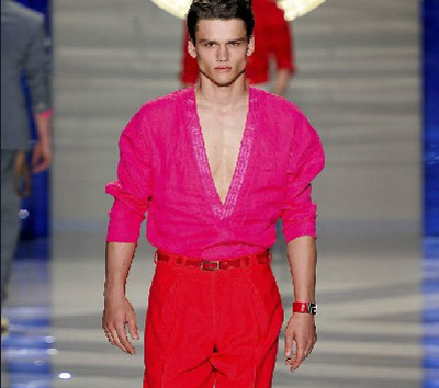 設(shè)計師Donatella Versace用柔軟的皮革面料來打造寬松及膝短褲與西裝,讓看似休閑感的廓型呈現(xiàn)出華麗,強硬的氣勢,衣襟處、褲裝側(cè)面都加上了大量的金屬搭扣裝飾,來進一步展現(xiàn)男性的剛強氣概。敞開穿著的寬松條紋長袍、絲質(zhì)V領(lǐng)襯衫帶來了海灘度假感覺,同時也仍是硬朗派型男們展示身材的絕佳“武器”。
