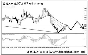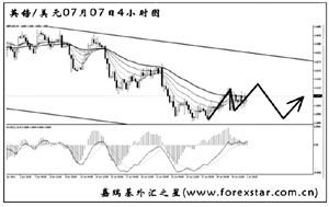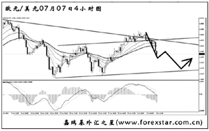 歐元兌美元此前的上漲刺破了日線圖形成的下降壓力線,但未能形成有效突破,短線匯價重新選擇下行,且力度強(qiáng)勁。圖中的震蕩通道為前一段時間形成,現(xiàn)在來看仍然起到一定的效果。預(yù)計歐元將首先向下挑戰(zhàn)通道下沿1.4140一線支撐,能否跌破成為后市繼續(xù)下跌的關(guān)鍵。